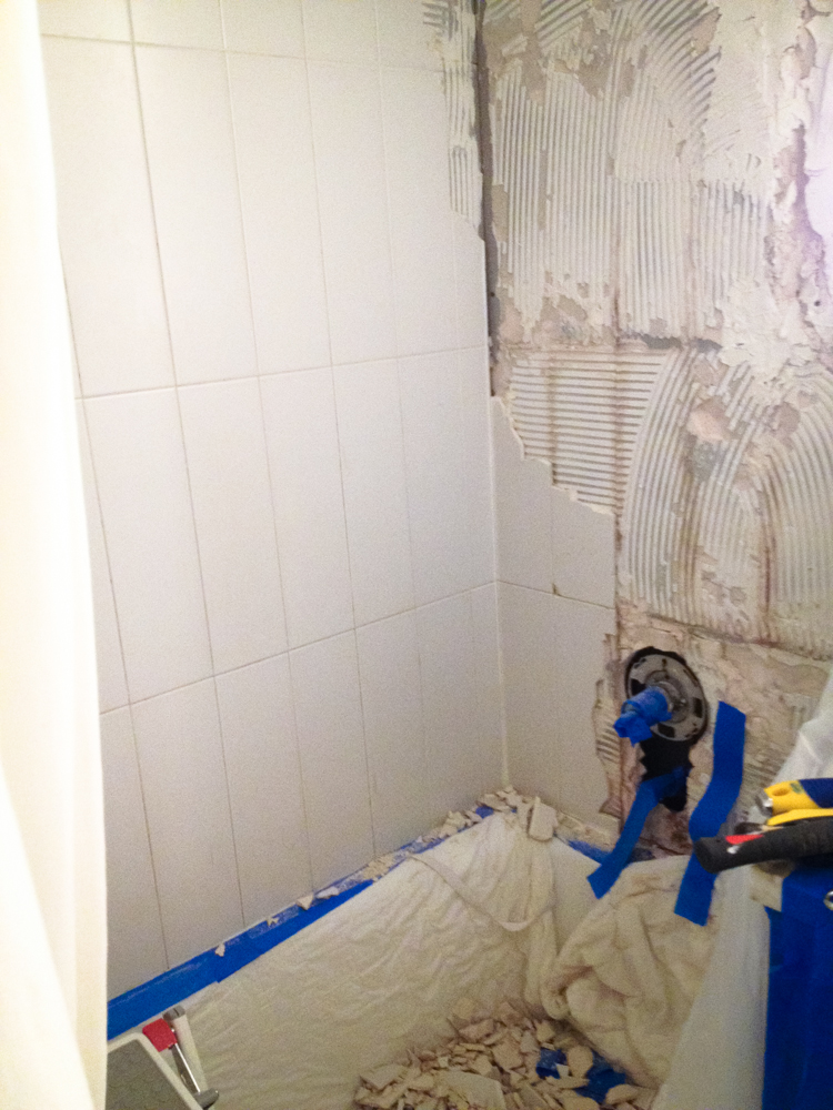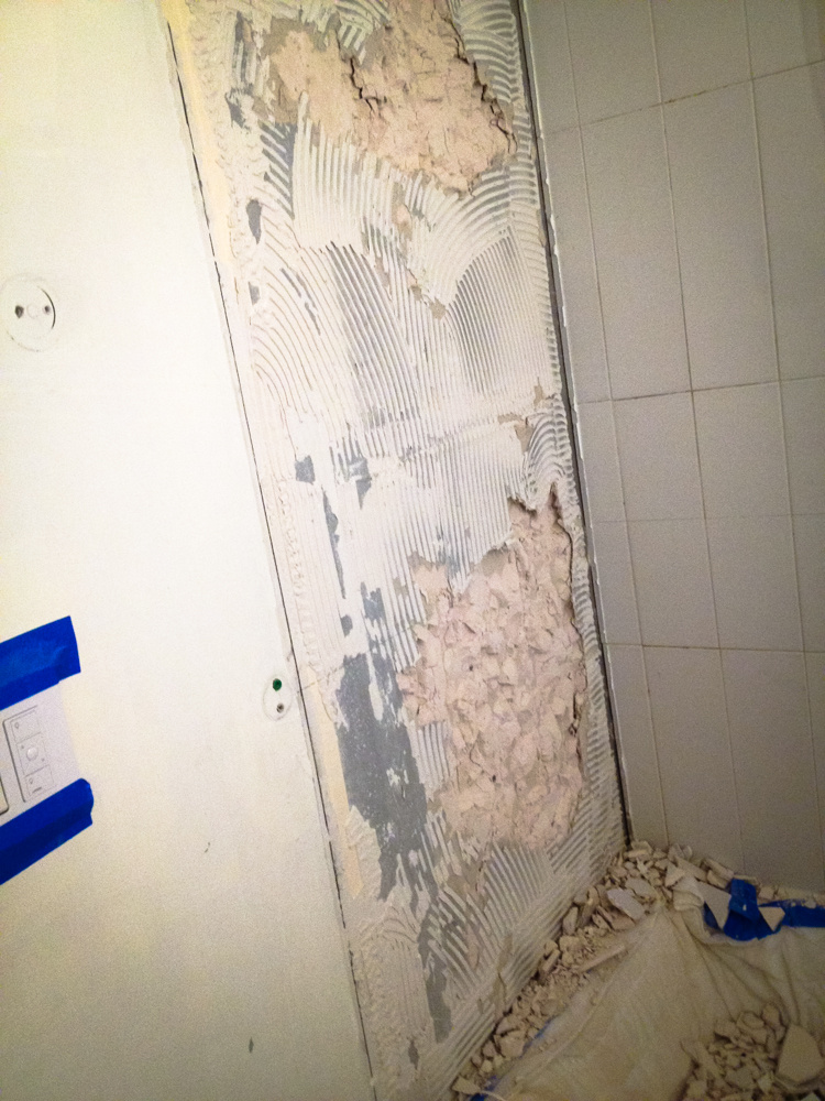 When I decided to install the bathroom tiles, I didn’t realize the hardest part was taking down the tiles without hurting the wall. The shower wall was in bad shape because the water went through the cracks on the grout. The water damaged the wall badly and made the dry wall very fragile. Every step of this tiling was not easy. The tiles I purchased weighted 500 lbs and were left on the curbside. I had to find help to move these tiles to my apartment. Drilling holes for hoses was difficult as well. It required special cutter and some force.