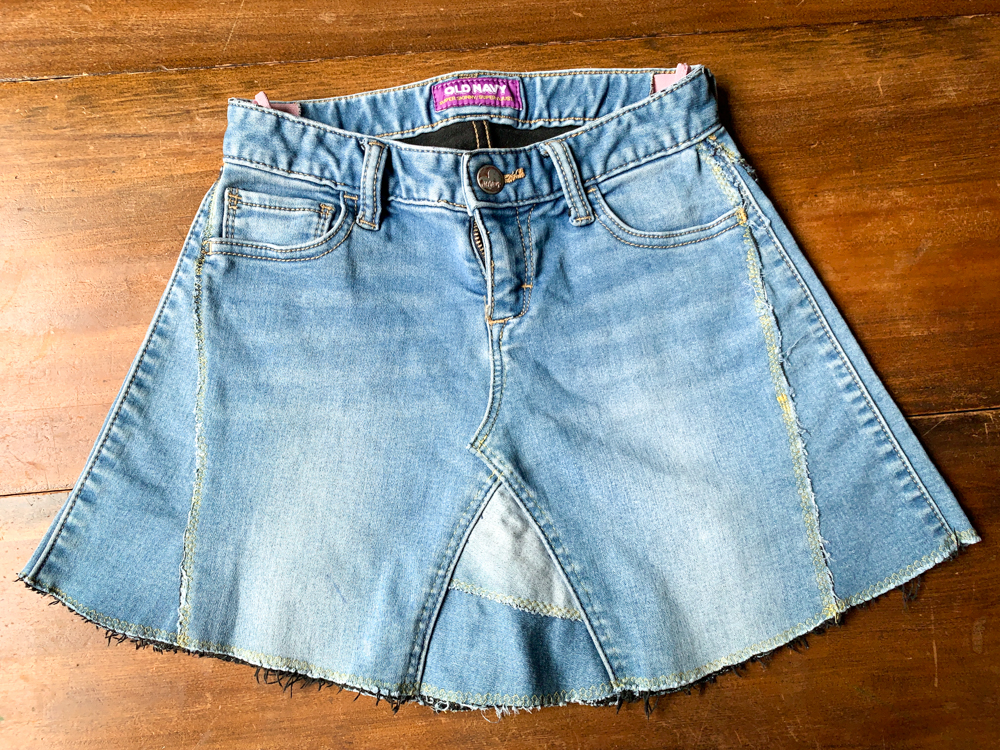 My daughter had a hand-me-down Old Navy jeans. The waist was a good fit but her thighs can not squeeze. The idea came to me and I decided this could be a nice flared skirt for her.
